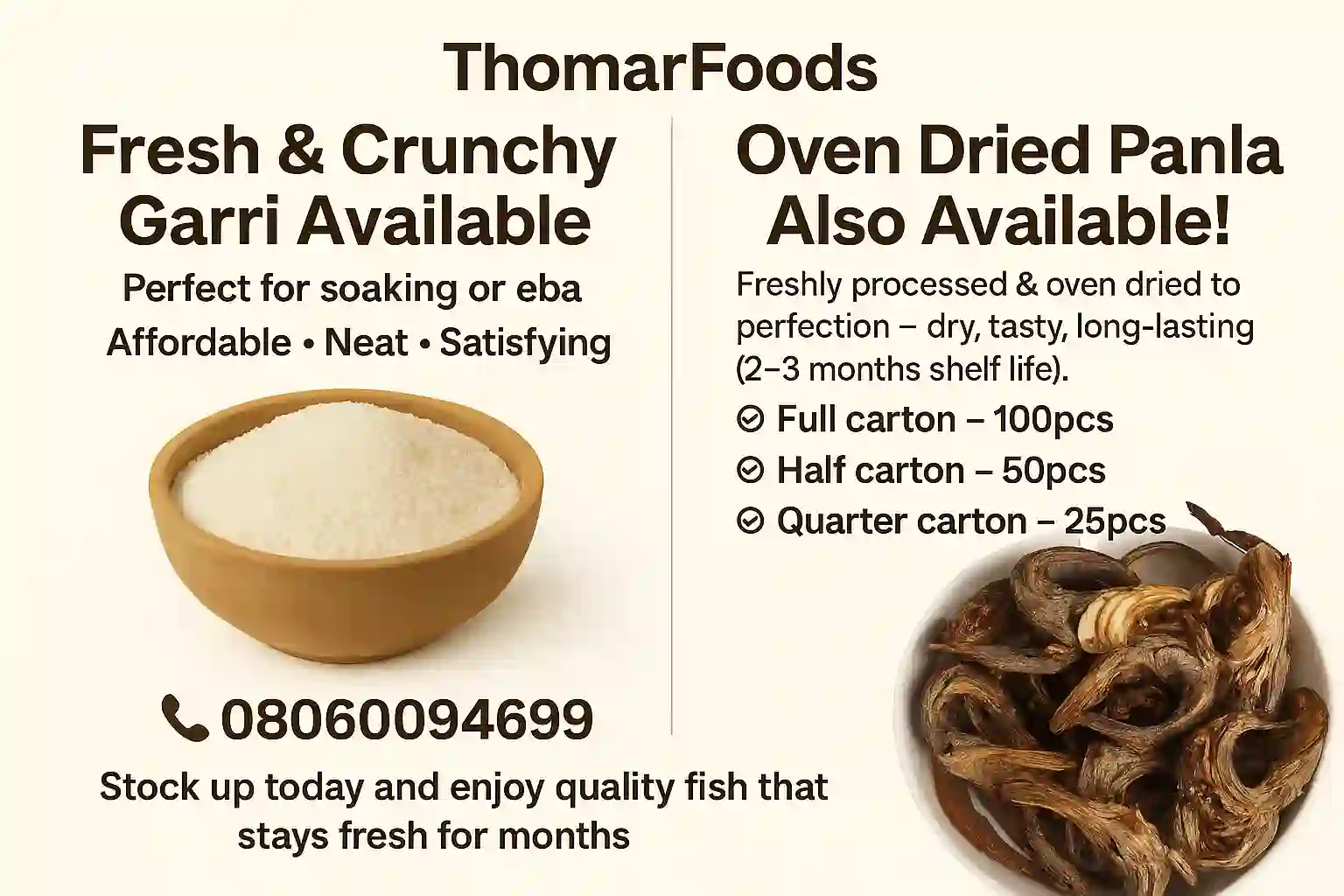 Our oven dried panla is dried to export standard has a shelf life of 2-3 months. Add to any meal of choice It's sold in carton of 100pieces, half and quarter